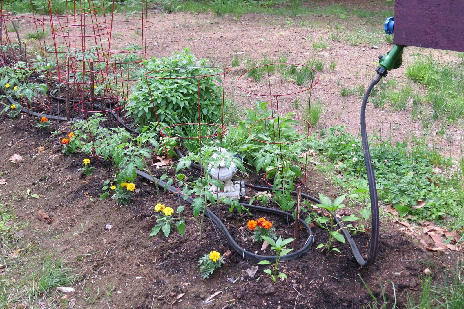 Three jalapeño plants at the front edge of the kitchen garden, then some Nice Girl tomatoes, the perennial herbs, some basil, marigolds, and then the Better Boy tomatoes. I painted my tomato cages red and I love how they look out there. So bright and happy.