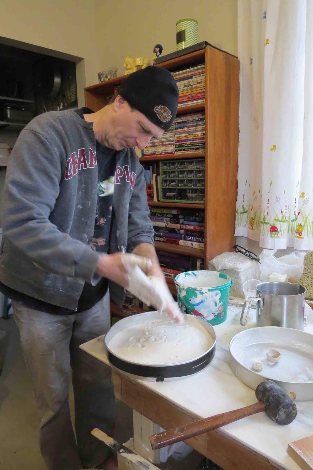 We'd been drying the clay on our marble wedging table but that wasn't working very well. For one thing, it ate up way too much space. When all that clay was spread out you couldn't use the table for anything else. So Chris decided to make up some plaster blocks of our own.